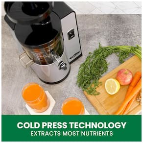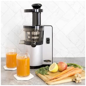 Espremedor de sucos vertical Omega VSJ843QS com sistema de limpeza automática e design compacto.Motor c/ dupla rotação