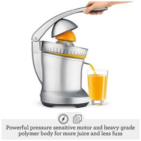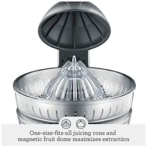 Espremedor de sucos Breville BCP600SIL com cone de sucos finos e cúpula de frutas para todos os tamanhos de citros. Possui peças laváveis na máquina de lavar louça e motor ultra silencioso.
