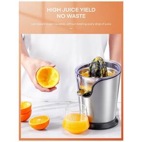 Facilmente Esprema Suco Fresco Este espremedor de laranja elétrico projetado com um filtro de aço inoxidável apertado e um motor potente, que pode efetivamente espremer todos os tipos de laranjas, limões e toranjas para suco cítrico fresco e puro Design conveniente Recipiente de suco transparente pode conter suco suficiente. O bico anti gotejamento controla a entrada e saída do suco, e os pés antiderrapantes e a tampa contra poeira evitam a entrada de poeira durante o zenamento. Cones de tamanho duplo O espremedor elétrico de frutas cítricas inclui dois tamanhos de cones intercambiáveis o pequeno é zenado dentro do grande. Seja um cítrico pequeno ou grande, de pequenos limões a toranjas podem ser facilmente espremidos sem desperdício. Fácil de usar Equipado com interruptor muito sensível que requer apenas uma quantidade mínima de pressão para iniciar. Pressione o cone levemente com a mão para espremer o suco e solte a pressão para parar, o que economiza energia e tempo. para que você possa desfrutar de um copo de suco fresco todas as manhãs. Construção de aço inoxidável Projetado com aço inoxidável, estrutura durável e de alta qualidade. A aparência bonita é muito adequada para o estilo da cozinha. E o corpo compacto não ocupa espaço na bancada da cozinha