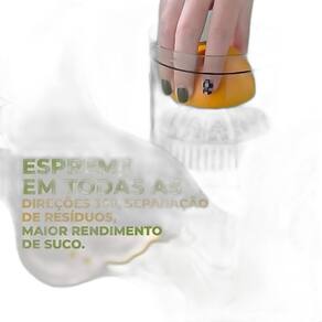 COMO USAR: 1 Corte as frutas ao meio, pode ser laranja ou outras frutas, dependendo do formato, é indicado que você corte em cubos; 2 Coloque no copo, respeitando a capacidade; 3 Feche a tampa até travar a mesma; 4 Pressione o botão até acender o led; 5 Aguarde o funcionamento e processo de extração do suco; 6 Espere que o suco chegue na marca limite; 7 Ao chegar na marca limite, abra o tampão e despeje o suco em um copo.