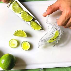 Modo de uso: corte fatias delicadas de limão ou até mesmo laranja, e pressione levemente a alça para extrair o suco do limão