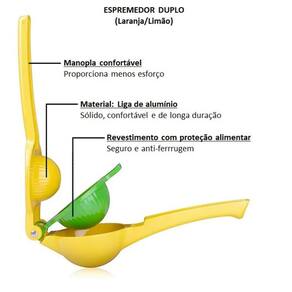 Possui dois compartimentos para extrair o suco da fruta, um para limão com área menor, e uma segunda área maior para laranja. Para utilização de acordo com a necessidade basta intercambiar na parte articulável do espremedor.