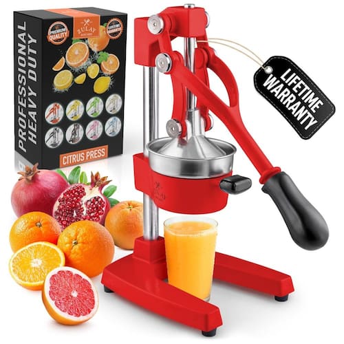 Extrai o máximo de suco possível espremedor de sucos mais eficiente e de qualidade profissional. Obtém o máximo de suco de laranjas, limões, limas, toranjas e outras frutas, sem sementes. Basta puxar a alça confortável e firme para baixo para obter os sucos cítricos mais rápidos e fáceis, enquanto suas mãos ficam limpas. Extrator de prensa manual de grau Feito de ferro fundido durável e resistente, com design ergonômico. Este espremedor de frutas cítricas de aço inoxidável usa efeito de alavanca e gravidade para fazer o trabalho com pouco esforço. A ação da alavanca praticamente faz o trabalho por você. Capacidades de britagem potentes e seguras. Esmague e espreme uma variedade de pequenas frutas e vegetais no conforto da sua cozinha. Mais frutas para desfrutar do que seu espremedor portátil o copo de de diâmetro permite que seja com vários tipos e tamanhos de frutas, ele pode lidar com a maior parte das toranjas maiores. Mais fácil do que espremedor de frutas manuais conhecidos como cotovelos mexicanos. Você e sua família vão adorar os sucos saudáveis e nutritivos que podem obter de maçãs, abacaxi, limões Meyer, limas Key, limaquats, limas mexicanas, limões Eureka ou Lisbon, limões cítricos Rangpur ou Tahiti, da Flórida, Califórnia ou no exterior