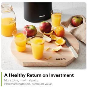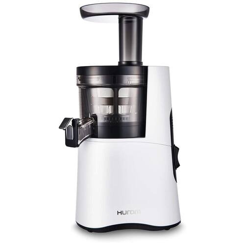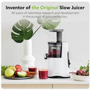 Espremedor Hurom com design aerodinâmico, tecnologia Slow Squeeze para preservar nutrientes, alavanca de controle e filtros para ajuste da polpa, versátil para frutas, vegetais, folhas, nozes e soja. Capacidade de fazer sucos, leite, tofu e sorvetes.Motor c/ dupla rotação