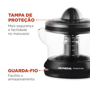 Para preparar um suco fresquinho e saudável de forma prática e rápida a qualquer hora do dia, conte com o espremedor Premium da Mondial. A sua jarra tem capacidade para 1,25L e é transparente para facilitar a visualização. Seus 2 cones facilitam o preparo, cada um para um tipo diferente de fruta, laranja ou limão. Sua dupla rotação e acionamento automático ajudam a espremer 100% do extrato da fruta. A Mondial é a marca de eletrodomésticos mais vendida do Brasil e a escolha de milhões de consumidores. Sempre inovando e buscando soluções para o bem-estar das pessoas, oferece uma linha completa de produtos. Em constantes pesquisas junto aos consumidores, seu portfólio ganha destaque na qualidade, no design moderno e na excelente relação custo x benefício. A Mondial orgulha-se de ser 100% brasileira e ser eleita pelo 4º ano consecutivo uma das melhores empresas em atendimento ao consumidor pelo Reclame Aqui. Disponível nos principais pontos de venda do Brasil, oferece mais de 1.400 pontos