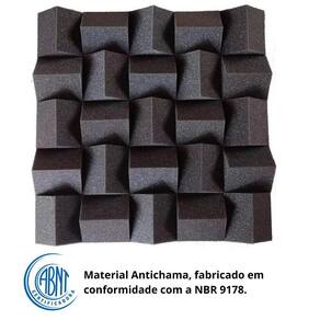 Especificações Dimensões: 50cm x 50cm Espessura: 6 cm Modelo: aplha formato de cunhas anecóicas Cor: cinza grafite Densidade: 26 kg/m Células abertas para uma boa absorção Chanfrada nas bordas em 40 graus para um melhor acabamento e junção entre as placas Marca: Armazém Das Espumas