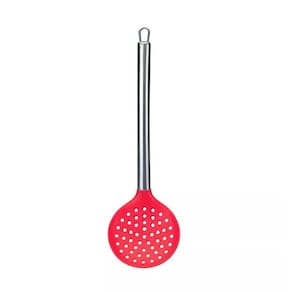 Utilize para retirar do óleo quente o bolinho ou a batata frita e também remove a espuma gerada no cozimento de alguns tipos de alimento. Em silicone com cabo em aço inox e alça para pendurar. O bojo em silicone é resistente ao calor. Não danifica o revestimento de suas panelas. Disponível na cor vermelha. Comprimento 34,5 cm, diâmetro 10,5 cm. Peso 120 g.