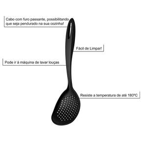 Ela é produzida em nylon na cor preto, resiste a temperaturas de até 180C e é ideal para uso em panelas com revestimentos antiaderentes ou cerâmicos.
