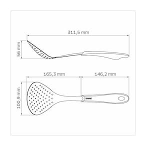 Espumadeira com lâmina de aço inox que proporciona resistência durante o uso. Cabo de polipropileno com furo passante possibilitando que seja pendurado na sua cozinha. Pode ir à máquina de lavar louças facilitando seu dia a dia. NA Ean: 7891112313149