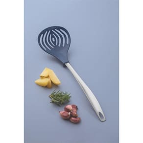 Espumadeira de nylon, que resiste até uma temperatura de 180 C. Cabo de aço inox com furo passante possibilitando que seja pendurado na sua cozinha. Utensílio ideal para uso em panelas com revestimentos antiaderentes e cerâmicos, pois não danifica o produto. Pode ir à máquina de lavar louças facilitando seu dia a dia.