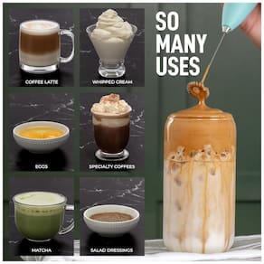 Matcha Whisking, Coffee More Funciona melhor do que um batedor matcha manual para fazer chá matcha e funciona muito melhor do que garfo ou batedor para café. Funciona muito bem para misturar bebidas nutritivas em pó de proteína sem recipiente extra, liquidificador ou agitador de garrafa para lavar. Use nosso mini mixer para suas necessidades de bater e misturar Dê um chute em batidos e smoothies saudáveis adicionando pó ou sabor de gemada e misturando.