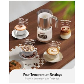 O equipamento oferece quatro faixas de temperatura: 45 °C, 55 °C, 65 °C e modo espuma fria, permitindo adaptar o uso a bebidas quentes e geladas. Os modos de operação incluem espuma quente densa, espuma quente mais leve, espuma fria, aquecimento sem espuma e preparo de chocolate quente. A seleção é feita pelo painel de controle com superfície sensível ao toque, que indica o modo ativo por meio de LEDs.