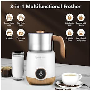 Desfrute de 8 funções em 1 com este sistema de vaporização de leite automático AMZCHEF! Transforme leite em espuma densa, leve, quente, chocolate quente, espuma de leite gelado, espuma de leite de castanha, espuma de leite de soja e comida para bebê à base de laticínios. Com aquecedor de leite automático, você pode preparar seu cappuccino, americano gelado, latte e cacau quente favoritos em casa a qualquer momento. O aquecedor de leite aplica aquecimento por indução seguro, aquecendo os ingredientes de forma envolvente e eficiente, evitando superaquecimento e queima. A tecnologia de acionamento magnético radial cria uma espuma de leite delicada rapidamente. Este sistema de vaporização de leite é fácil de operar com apenas um botão, display OLED moderno e de alta tecnologia, permitindo que você controle facilmente as funções. Fácil de limpar com copo dividido.