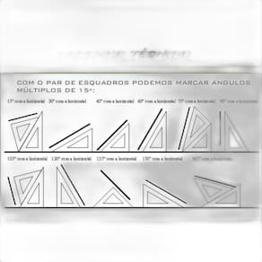 Características : Ângulos dos esquadros : 45/45/90º Tamanho : 42 cm Espessura : 2mm padrão desenho técnico Adicionas : sem chanfro e sem marcações Marca : fenix