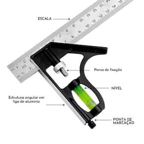 Descrição: Indicado para medir profundidade de canais, traçar linhas paralelas, marcar chapas metálicas, nivelar superfícies, ajustar máquinas, etc. Graduação em milímetros nas duas faces. Gravação em baixo relevo Régua deslizante. Determina se paredes, pisos e quaisquer encontros entre superfícies estão alinhados ou seja, se o ângulo entre elas é de 90°. Informações Técnicas: