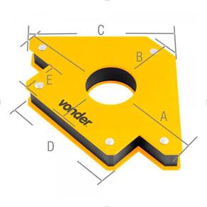 Ref.: 3599030000. Marca: Vonder. Capacidade: 30 kgf. Ângulos (graus): 135°, 90° e 45°. Espessura: 25 mm. Medida (A): 190 mm. Medida (B): 122 mm. Medida (C): 113 mm. Medida (D): 112 mm. Medida (E): 33 mm. Massa aproximada (peso):1,08 kg.