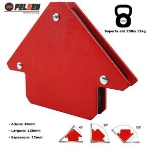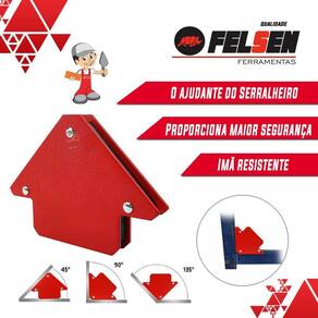 Esquadro de solda magnético 12 kgs ângulos de 90º ,45º e 135º - aumente a sua produtividade usando o esquadro magnético da felsen, que é uma ferramenta essencial para soldadores que trabalham sozinhos, justamente por alinhar e fixar peças permitindo que as mãos sejam ocupadas somente com os itens para solda. DescriçãoOs esquadros magnéticos felsen são dispositivos de soldagem magnética multi- ângulos projetados para a fixação rápida e precisa de metais ferrosos planos e redondos, para trabalhos de montagem de solda, oferecem ângulos de 135º, 90º e 45º com precisão, capacidade de 12kg 25lbs .Esquadro do tipo magnético possui lâmina em aço inox e base de alumínio, oferecendo resistência e durabilidade.Características- o ajudante do serralheiro segura as peças - menor necessidade de ajuda de outra pessoa - aumento de produtividade- proporciona maior segurança diminui o risco de acidentes de queimar as mãos com respingos de solda - imã resistente- precisão na soldagemFicha técnica- suporta até 25lbs 12kg- precisão dos ângulos: 45º/ 90º/ 135º- altura: 85mm- largura: 120mm- espessura: 12mm- material: Indicação de usoSolda - soldagem - montagem - marcação - instalação - suspensão - elevaçãoO que acompanha - esquadro de solda magnético 12 kgs Marca: Felsen