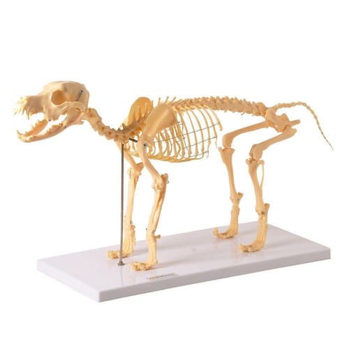 Esqueleto de cachorro confeccionado em resina plástica rígida em cor natural, composto por estrutura esquelética parcialmente desmontável (com cabeça móvel), fixo em suporte.