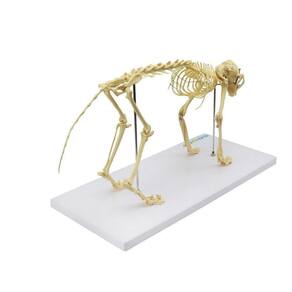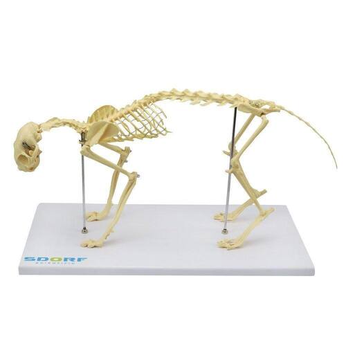 Modelo anatômico de esqueleto de gato, é confeccionado totalmente em resina plástica, Representa um animal de porte grande e de forma detalhada, com 25 cm de altura, possibilita a movimentação de alguns membros; Com o modelo anatômico de esqueleto de cachorro de porte pequeno SD-9200 é possível identificar as seguintes estruturas dentre outras: Esqueleto Apendicular Cabeça com mandíbula articulável e dentes; Vértebras cervicais; Vértebras torácicas; Vértebras lombares; Costelas com 13 pares; Esterno; Ossos do sacro; Ossos da pelve; Osso da cauda; - Esqueleto Pendicular: Membros dianteiros direito e esquerdo: Escápula, úmero, rádio, ulna, ossos do carpo e pisiforme, ossos do metacarpo, ossos sesamoíde e falanges; Membros traseiros direito e esquerdo: Fêmur, patela, tíbia, fíbula, tarso, metatarso, sesamoide e falanges.