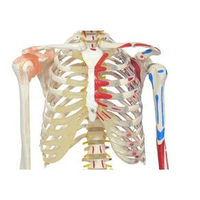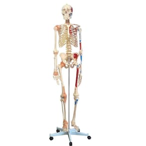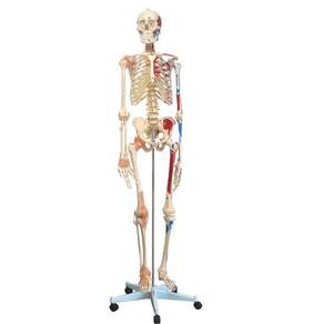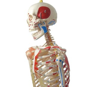 Modelo de esqueleto humano padrão, articulado com aproximadamente 168cm de altura. Confeccionado em resina plástica rígida na cor natural.Composto por:Ossos do Crânio (Calota Craniana, Arcada Dentária com três dentes removíveis sendo: Incisivo lateral, 1 Pré-molar, 2 Molar, Cavidade Nasal, Condutos auditivo, Cavidade Orbitaria, Osso Frontal, Temporal, Vômer, Nasal, Palatino, Etmoides , Maxila, Mandíbula, Parietal, Zigomático, Lacrimal, Esfenoide, Occipital)Ossos da Coluna Vertebral (7 vertebras cervicais, 12 vertebras torácicas e 5 vertebras lombares)Saída de nervo espinhalProlapso em Disco GelatinosoArtéria vertebral cervicalOssos do Tórax (Osso Esterno, e Costelas)