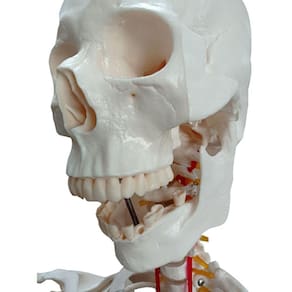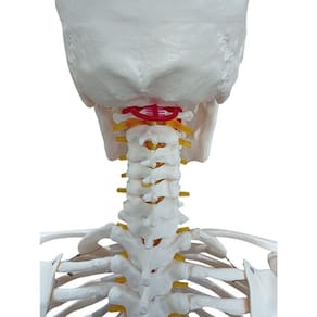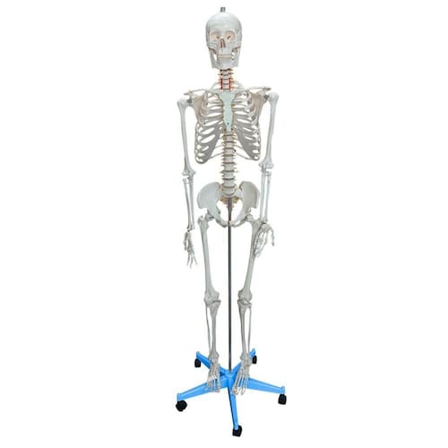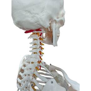 Modelo anatômico de esqueleto humano, medindo aproximadamente 170cm, padrão, articulado, evidencia nervos, artérias cervicais e osso hioide. Apresenta prolapso entre a 4 e 5 vértebra lombar. Confeccionado em resina plástica, montado sobre base.