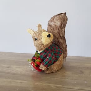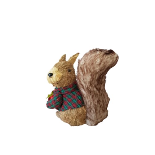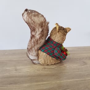 ESQUILO COM ESTRUTURA EM EPS E ARAME, REVESTIDO COM PALHA NATURAL, PELE ARTIFICIAL, CASACO E CACHECOL DE LÃ XADREZ.