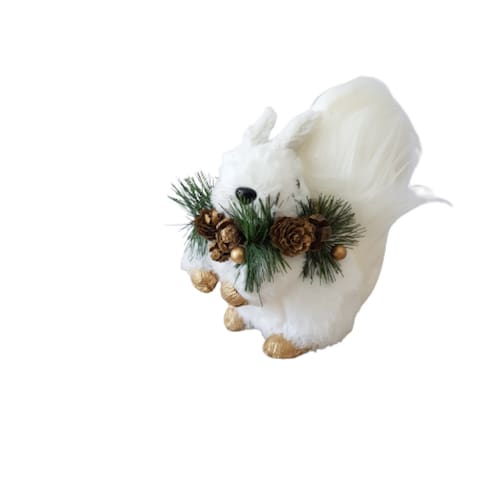 ESQUILO DECORATIVO COM ESTRUTURA EM EPS E ARAME, REVESTIDO COM PELE E PELOS ARTIFICIAIS BRANCOS E ADORNO NO PESCOÇO.