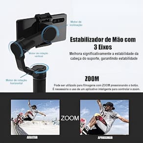 Equipado com um sistema de 3 eixos, ele oferece: - Movimento Horizontal Pan : de -70 a 260, possibilitando capturas panorâmicas amplas. - Movimento Vertical Roll : de -80 a 260, ajustando o ângulo do dispositivo. - Inclinação Tilt : de -75 a 285, perfeita para criar composições dinâmicas em diferentes ângulos.