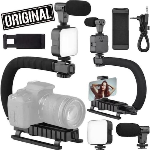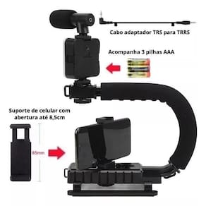 Kit estabilizador de mão tipo escorpião para câmeras e smartphones, com luz LED e microfone unidirecional. Estrutura em plástico ABS resistente, pino 1/4 deslizante para encaixe de equipamentos e sapata hot shoe para acessórios. Microfone supercardioide com resposta de frequência de 50Hz-16kHz. Luz de LED com potência de 5W e cor de 6500K.Vendido e entregue por Olist Top