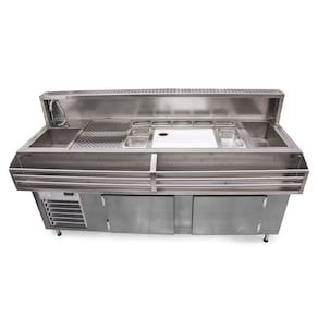 Funcionalidade Versátil: A Estação Bar Refrigerada com Pia oferece diversas funcionalidades em um único espaço, incluindo uma cuba para pia, nichos para cubas gastronômicas, espaço para gelo, placa de corte, pingadeira superior e nicho para garrafas. Isso proporciona um ambiente prático e eficiente para o preparo de bebidas.