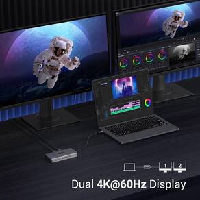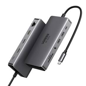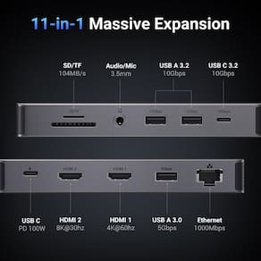 UGREEN Estação de ancoragem para laptop Revodok Pro 211 em 1 USB C Dock Dual HDMI 4K@60Hz Single 8K @30Hz 10Gbps 10Gbps PD Gigabit Ethernet, leitor de cartão SD/TF compatível com Thinkpad, Zenbook e - Estação de ancoragem USB C 11 em 1: inspire mais potencial da porta USB-C do seu laptop com duas portas HDMI, uma porta USB-C 3.2 Gen 2 de 10 Gbps, duas portas USB-A 3.2 geração 2 de 10 Gbps, um USB A 3.0, entrega de energia de 100 W, leitor de cartão RJ45 de 3,5 mm e SD/Micro SD. - Tela multimonitor: a estação de ancoragem HDMI dupla conectará dois monitores a ambas as portas HDMI em 4K a 60Hz no máximo, o que torna a multitarefa em tela cruzada e os fluxos de trabalho criativos ainda mais eficientes. Conecte a um único monitor através do HDMI 2 para visualizar o conteúdo em até 8K a 30Hz. Observação: os MacBooks suportam apenas o modo de espelhamento - Inicie a era USB 3.2: transfira arquivos, filmes e fotos em velocidades de até 10 Gbps através da porta de dados USB-C e duas portas USB-A . A porta C marcada com 10 Gbps só pode ser usada para transmissão de dados e não suporta saída de vídeo ou carregamento. - Entrega de energia de 100 W: a base USB C suporta carregamento de passagem USB-C de até 85 W via porta USB-C PD, reserva 15 W para outras operações de interface. - Ethernet ultrarrápida: o hub USB-C tem uma porta Ethernet de 1000 Mbps que dá a você a vantagem de conexões de internet de alta velocidade.