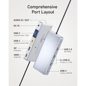 - Mais conexões, mais possibilidades: experimente a conveniência de portas versáteis, incluindo 3 portas USB-C Power Delivery, 2 portas USB-A, uma porta de dados USB 2.0, uma porta HDMI, uma DisplayPort e uma porta AUX de 3,5 mm.