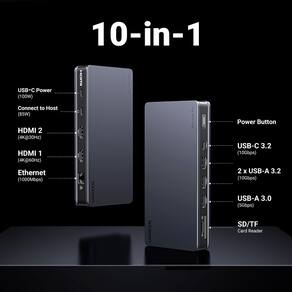 - Expansão 10 em 1: Simplifique sua conectividade com a estação de ancoragem de monitor duplo 10 em 1. Possui 2 HDMI 4K, 1 PD 3.0 100W, 2 USB A 3.2 (10 Gbps), 1 USB C 3.2 (10 Gbps), 1 USB A 3.0 (5 Gbps) e 1 Gigabit Ethernet, atendendo a quase todas as suas necessidades diárias de trabalho.