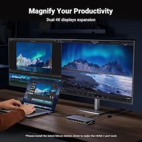 - Monitores duplos estendidos para macOS: aumente sua eficiência de trabalho com a tecnologia de movimento de silicone da estação de ancoragem UGREEN USB C para estender dois monitores 4K para laptops macOS e Windows. Escolha entre modos de exibição estendida ou espelhada sem esforço. (A porta HDMI 2 requer instalação do driver para funcionar)