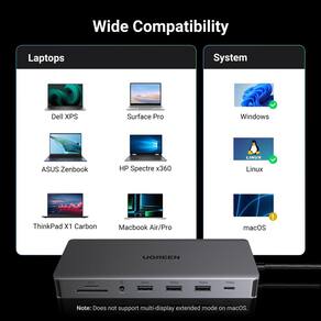 - Monitor triplo: suporta tela tripla de até 4K. Suporta monitores únicos e duplos de até 4K a 60Hz. Observe que, devido a limitações do MacOS, todos os monitores estendidos exibirão o mesmo conteúdo ao conectar um MacBook.