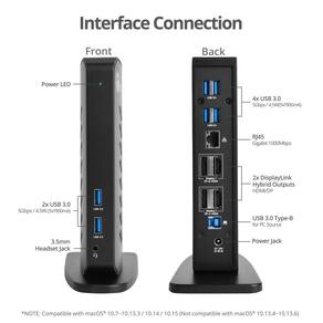 - adiciona uma porta USB 3.0 tipo B (inclui cabo USB-A para USB-B e cabo USB-C para USB-B para facilitar a conversão), duas portas de saída de vídeo HDMI, duas portas de saída de vídeo DisplayPort, seis portas USB 3.0 tipo A, uma Gigabit Ethernet e um conector de áudio de 3,5 mm para conectar fone de ouvido/alto-falante estéreo ou entrada de microfone