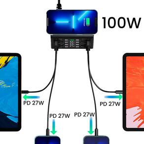 A estação de carregamento oferece uma potência total combinada de 100 watts, garantindo carregamento rápido e eficiente para todos os dispositivos conectados.