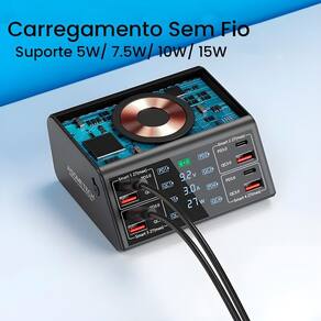 Potência Total: 100W Entradas USB-A: 4 Entradas USB-C: 4 Suporte a Carga Sem Fio: Sim, compatível com Qi Tensão de Entrada: 100-240V Saída USB-A: 5V/2.4A máximo por porta Saída USB-C: Até 20V/5A dependendo do dispositivo Proteções: Sobrecarga, sobrecorrente, sobreaquecimento, curto-circuito Dimensões: Aproximadamente 15 cm x 10 cm x 3 cm Peso: Aproximadamente 450g