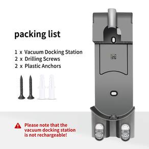 Apresentamos nosso suporte para aspirador de pó – o melhor acessório para aspiradores de pó sem fio Dyson V6 DC59. Feito de plástico de alta qualidade, este suporte não é apenas superresistente, mas também projetado para fácil instalação com parafusos na parede. O suporte de parede serve como uma solução que economiza espaço, permitindo que você organize perfeitamente seu dispositivo portátil e acessórios. A estação de ancoragem é uma peça de substituição compatível com aspiradores portáteis da série Dyson V6, com um suporte de parede especializado Dyson para armazenamento eficiente de acessórios. Mantenha seus itens essenciais de limpeza ao alcance do braço enquanto mantém um ambiente livre de bagunça. O s.tand não apenas atua como um suporte de fixação, mas também facilita o carregamento do seu aspirador portátil. Maximize a funcionalidade de suas ferramentas de limpeza com nosso suporte a vácuo. Economize espaço, organize acessórios e carregue o seu portátil sem esforço. Este suporte é perfeito para famílias que buscam uma solução elegante e prática para manter a ordem em sua rotina de limpeza. Atualize sua experiência de limpeza com o suporte a vácuo – onde a conveniência encontra a eficiência - Compatibilidade: Compatível com aspiradores de pó sem fio Dyson DC59, série V6, substitui a parte 965876-01 (observe que a estação de ancoragem a vácuo não é recarregável!) - Suporte durável e firme: a construção de plástico de alta qualidade garante um suporte resistente com uma grande capacidade de carga, evitando quedas e quebras. - Design que economiza espaço: o suporte de parede organiza acessórios, economiza espaço e facilita o carregamento sem bagunça no chão. Precisa ser utilizado com um carregador, a estação de ancoragem em si não é recarregável. - Fácil instalação: configuração sem complicações com kit de suporte de parede incluído e parafusos para uma estação de ancoragem estável. - Incluído na embalagem: cada pacote inclui 1 suporte de parede, 2 parafusos e 2 âncoras para uma configuração completa.