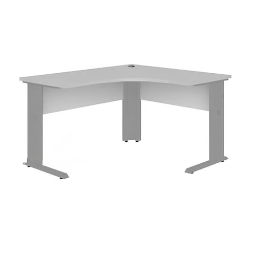 Estação de trabalho, com o tampo em formato de "l", confeccionado em madeira mdp-bp de 15mm de espessura revestido em ambas as faces com laminado melamínico na cor cc-cinza cristal com o acabamento das bordas com perfil de pvc flexível arredondado a 180 graus na cor cinza cristal, com três orifícios no tampo para passagem de fios, com os pés confeccionados em aço com tratamento anti ferrugem e pintura eletrostática a pó na cor cc-cinza cristal com ponteiras rígidas de polipropileno na cor cinza, com sapatilhas reguladoras de desnível de piso e com calhas verticais no pés para passagem de fios.