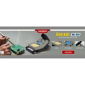 Modelo: HK-930 A Estação de Solda Digital Modelo HK-930 se destaca por facilitar a remoção e a soldagem de componentes PTH e SMD e pela faixa de temperatura ajustável. Possui controle digital de temperatura com display iluminado, design compacto, fácil de usar, aquecimento rápido e ajuste adequado de temperatura. Possui também uma mini gaveta na base que possibilita guardar peças de reposição e um suporte para o ferro de soldar embutido. Display Digital LCD Iluminado Pico de Potência: 50W Potência Nominal: 50W Temperatura Ajustável: 160C a 520C (10C) Controle Digital de Temperatura Tensão de Alimentação: 127V (verificar a tensão de alimentação antes de ligar o equipamento) Mini gaveta na base Resistência: Mica Dimensões: 230x97x170mm Peso: Aproximadamente 600g