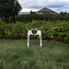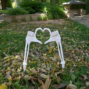 Este conjunto exclusivo apresenta mãos esqueléticas esquerdas e direitas dispostas em uma pose de amor, criando uma exibição cativante que é perfeita para seu quintal ou jardim.