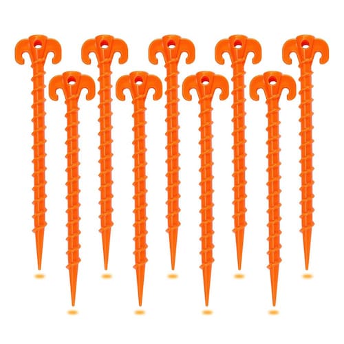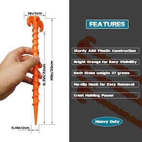Por que nossas estacas de plástico são melhores do que as da concorrência? Heavy Duty e Ultra Strong Nossas estacas de barraca são fabricadas em plástico ABS de qualidade que não enferruja nem se deteriora. A construção em plástico ABS também torna essas estacas mais resistentes e duráveis. Alta visibilidade e conveniência Em laranja brilhante, essas estacas de gancho NÃO SE PERDERÃO na grama alta; o grande gancho antiderrapante foi projetado para facilitar a remoção. Grande poder de retenção O design em espiral dá a essas estacas um poder de retenção incrível em uma variedade de tipos de solo - 10 polegadas/250 mm de comprimento total. Feito para acampamento, caminhada e jardinagem - E você pode se juntar a eles adicionando ao seu carrinho hoje mesmo! - MATERIAIS DE QUALIDADE — Feitos de materiais plásticos ABS duráveis e leves (NÃO PLÁSTICO PP BARATO). Cada estaca de plástico pesa cerca de 1,3 onças, mas é inquebrável - 10 polegadas/250 mm de comprimento. - MAIS PRÁTICAS - Ao contrário do metal, as estacas de plástico para barracas não enferrujam nem se deterioram - são reutilizáveis e fáceis de guardar em sua mochila de acampamento para projetos futuros. - ESTRUTURA EM ESPIRAL - Essas estacas em espiral são projetadas com recurso anti-desprendimento, o que as torna fáceis de inserir no solo e fixá-las com segurança no local. Com a ponta em espiral, ela não é facilmente solta, confiável e duradoura. - ALTA VISIBILIDADE E CONVENIÊNCIA - Em laranja brilhante, essas estacas de plástico NÃO SERÃO PERDIDAS na grama alta ou na praia. O grande gancho antiderrapante foi projetado para facilitar a remoção. - ACESSÓRIOS ESSENCIAIS - O design em espiral também torna essas estacas fáceis de torcer em terra macia ou areia e reduz o risco de vento e chuva forte para manter sua barraca no lugar com segurança. Ótimo para praia, copas, tendas, gazebos, lonas, lençóis e jardinagem.
