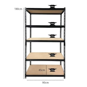 Características técnicas: - Marca: Strom - Ref.: SP361872 - Dimensões da estante: 90cm C x 45cm L x 180cm A - Dimensões da embalagem: 96cm C x 46cm L x 8cm A - Espessura da barra de metal: 1.2mm - Espessura da placa de aglomerado: 9mm - Capacidade por prateleira: 72kg - Capacidade total da estante: 360kg