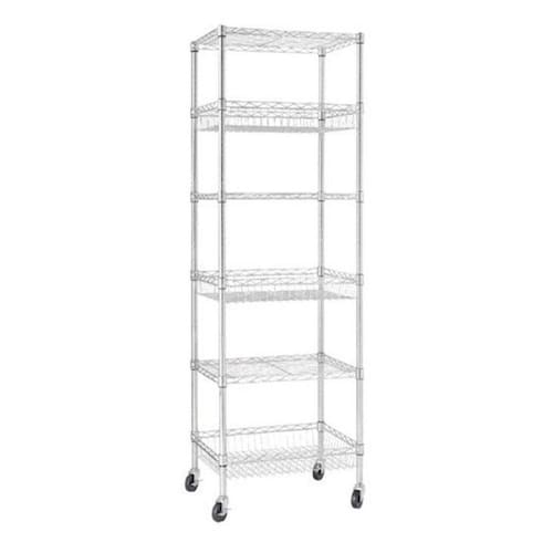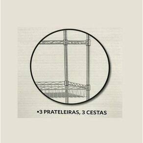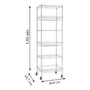 Contem 3 prateleiras e 3 cestas - 6 prateleiras no total - 4 rodas fortes 2 com travas - altura total com rodinhas 1,90 cm - fácil de montar - nenhuma ferramenta requerida - dimensoes: 190,50 cm altura x 60,90 largura x 45,70 cm profundidade - em aço zincado; - peso total suportado 226kg; - para uso comercial ou residencial;