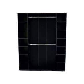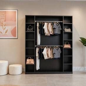 Com 14 nichos laterais e 2 cabideiros, oferece amplo espaço para guardar roupas, calçados e acessórios. Perfeito para closets residenciais ou lojas, adapta-se a diversos estilos de decoração. Dimensões gerais: