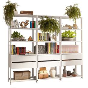 - Três Estantes Multiuso de 70 cm de largura com quatro prateleiras e duas gavetas em cada