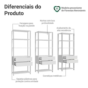 Além disso, o móvel possui um acabamento branco de alta resistência, pés com sapatas plásticas que oferecem proteção contra a umidade e ferragens inclusas para fição na parede, assegurando maior estabilidade e .