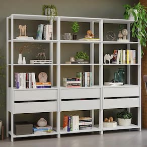 Composta por três módulos, cada um com quatro prateleiras e duas gavetas, essa estante oferece amplo espaço de armazenamento, ideal para organizar livros, objetos decorativos e outros itens do seu dia a dia. As prateleiras garantem fácil visualização e acesso aos itens maiores, enquanto as gavetas proporcionam um local perfeito para guardar objetos menores, mantendo o ambiente organizado.