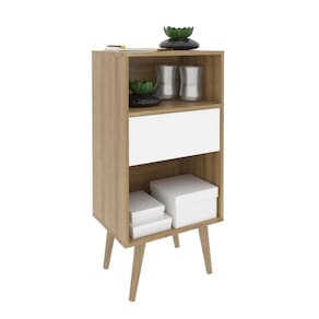 Possui um nicho aberto e uma gaveta para guardar objetos, livros ou itens decorativos, além de pés cônicos em madeira de eucalipto que garantem leveza ao design.